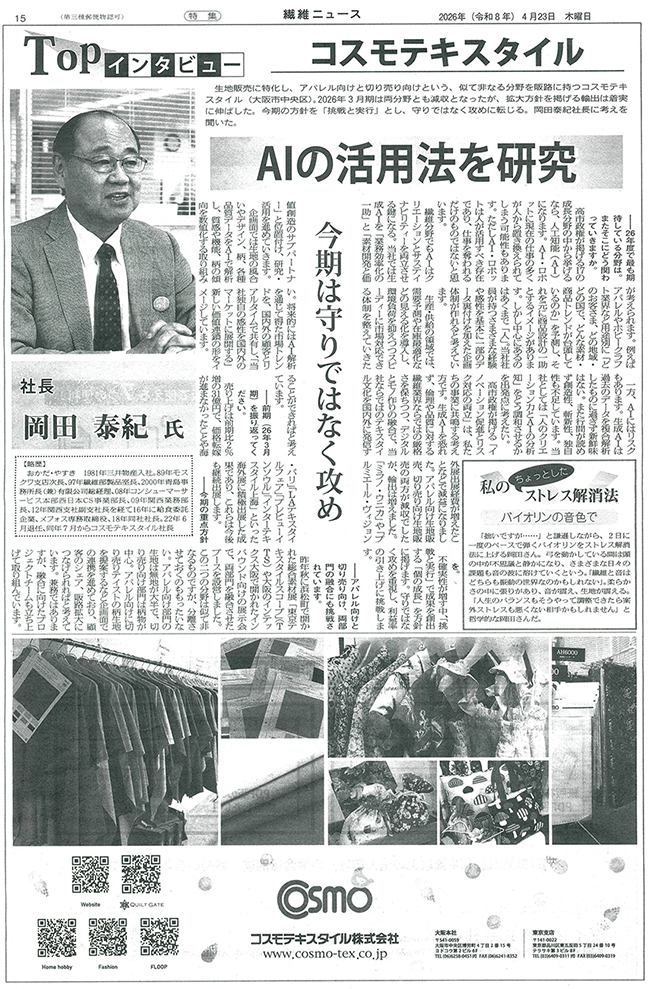 NEWS ALL FOR HOME HOBBY FOR FASHION ALL 2026.04.23 代表インタビューが繊維ニュースに掲載されました 代表インタビューが繊維ニュースに掲載されました Previous List